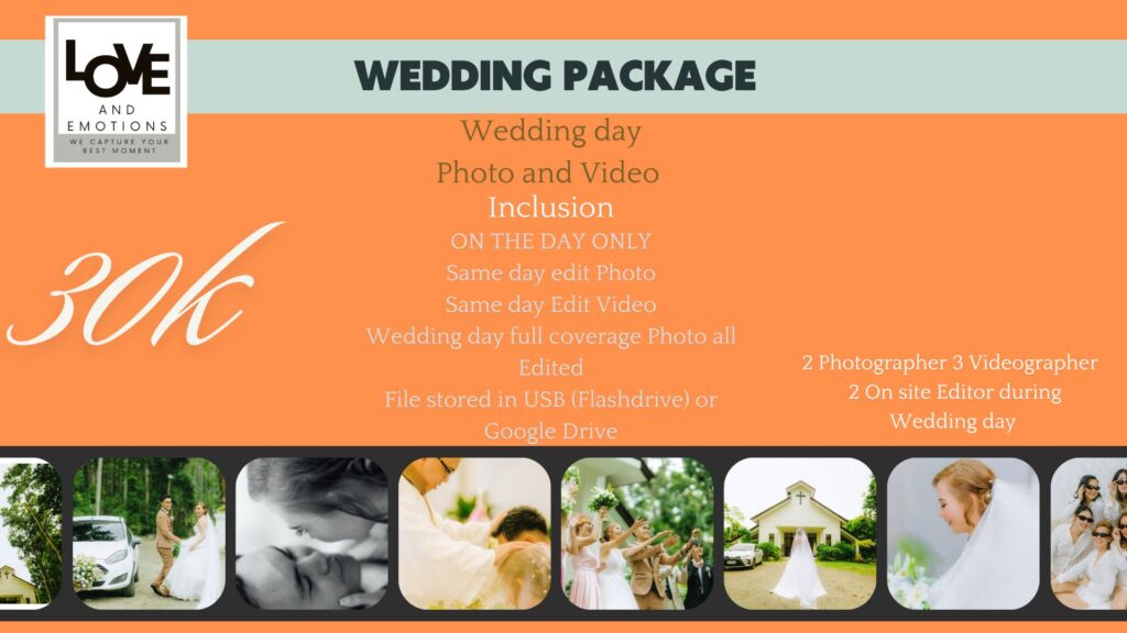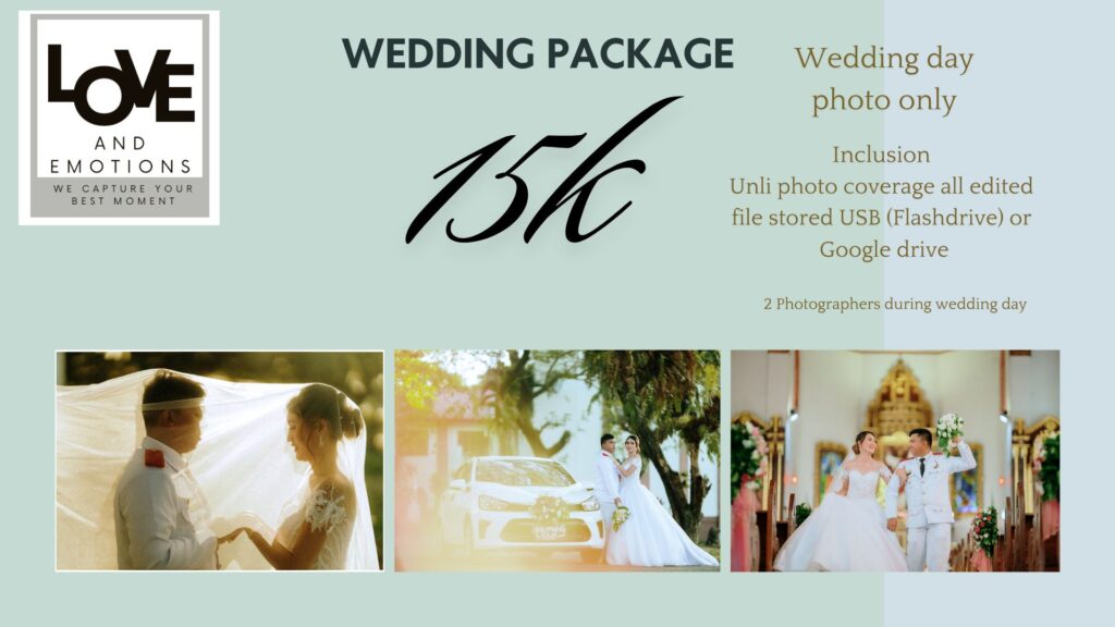 Capture every beautiful moment of your special day with our essential “Wedding Day Photo Only” package! For just ₱15,000, you’ll receive unlimited photo coverage…..