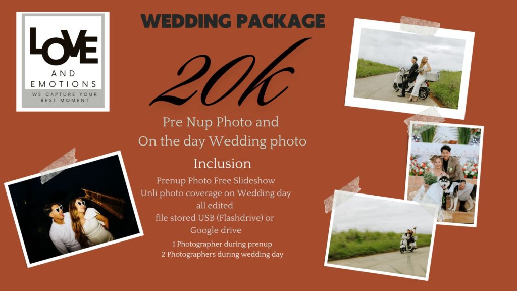 Get the best of both worlds with our “Pre-Nup Photo and On-the-Day Wedding Photo” package for only ₱20,000! This package includes a beautiful Prenup Photo Free Slide…